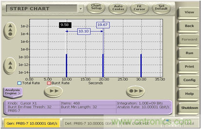 由于客戶的系統要進行長時間的(-20到+80度下)的高低溫老化測試,客戶要看誤碼的性能和溫度變化的相關性,一般的誤碼儀只能統計溫度變化過程中誤碼的總的個數和誤碼率,而無法得知在整個十幾個小時里面任一時刻誤碼率的變化。而BSX系列誤碼儀則可以使用Strip chart的記錄功能將整個過程中記錄下來,后面可以根據需要查詢任意時刻的誤碼率變化情況。如下圖,在第10/20/30秒的時間點出現了一些突發的誤碼,這個如果僅僅是通過簡單的誤碼統計是無法看到時間相關的細節的,而且其累積記錄時間可以長達幾十小時甚至幾天。
