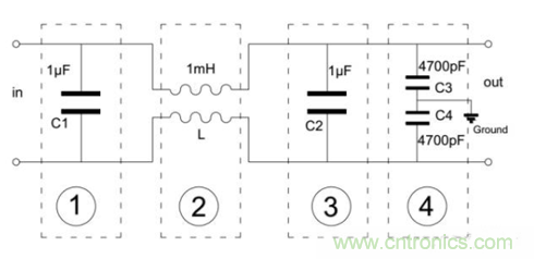 如圖1,3為差模電容,2為共模電感,4為共模電容。