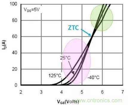 器件的失效處取決于脈沖時間、散熱條件和功率MOSFET單元平衡性能。通常,ZTC對應的電流越大,對應的VGS越大,就越容易發生熱不穩定性問題。而且ZTC直接和跨導相關,跨導增加,ZTC點向更高的VGS點移動。