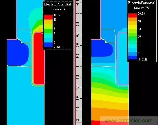 圖7:Trench(左)和SGT屏蔽柵電流線分布圖