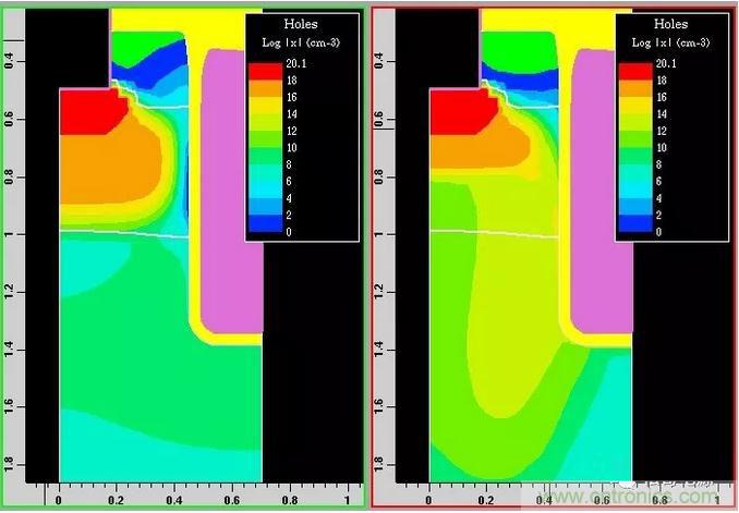 空穴電流產生后,就會通過MOSFET內部的BODY體區流向S極,這也導致有可能觸發寄生三極管,對功率MOSFET產生危害。由空、電流線穴分布圖可見:線性區工作時產生明顯的空穴電流,電流線也擴散到P型BODY區。