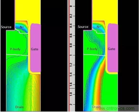 從電勢分布圖,功率MOSFET完全導通時,VDS的壓降低,耗盡層完全消失;功率MOSFET在線性區工作時,VDS的電壓比較高,耗盡層仍然存在,此時由于在EPI耗盡層產生電子-空穴對,空穴也會產生電流,參入電流的導通。