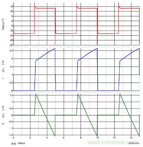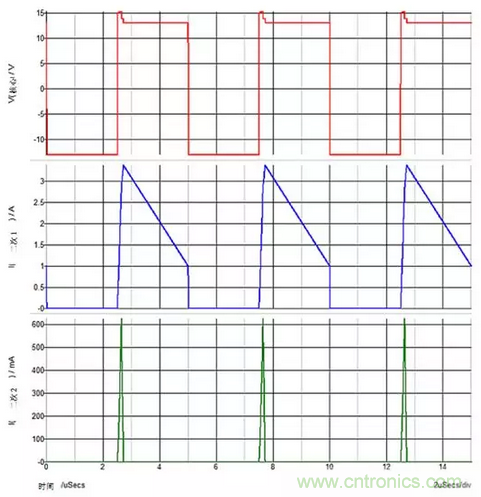 圖3:重載次級1和輕載次級2。基座電壓對次級2的輸出電容器進行峰值充電。