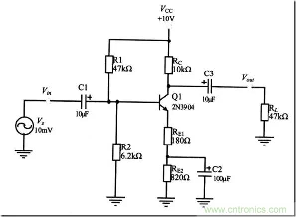 上圖是基極分壓式共射極放大電路,更為常用的電路圖如下圖所示:(圖中各參數值可以不用理會,僅作說明)