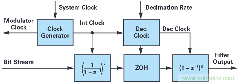 傳統(tǒng)的三階sinc濾波器如圖1所示。濾波器通過(guò)按比例縮放系統(tǒng)時(shí)鐘來(lái)生成ADC的調(diào)制器時(shí)鐘,而ADC則向?yàn)V波器返回一個(gè)1位數(shù)據(jù)流。濾波器功能本身包括三階級(jí)聯(lián)積分器 1/(1 – z–1)(時(shí)鐘速率與調(diào)制器速率相同)和三階級(jí)聯(lián)微分器 1 – z–1(時(shí)鐘速率為抽取時(shí)鐘)。