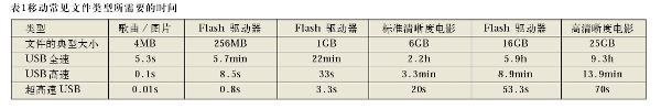 因此,基于Flash的外圍設備將受益并最終需要高得多的超高速USB 數據傳輸速率。其中,包括最常見的USB外圍設備——無處不在的Flash 驅動器!表1總結了從USB全速到高速,再到超高速USB的用戶體驗。需要與個人計算機之間進行大量文件或較大文件快速移動的多媒體應用將會從超高速USB中獲益良多。它為那些需要在計算機和便攜式消費類產品之間同步多媒體數據的用戶提供了滿意的帶寬。