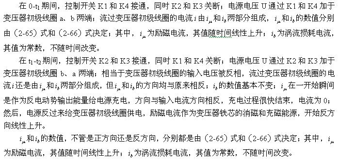 根據前面分析,磁滯損耗主要由勵磁電流 產生的,但雙激式開關變壓器初級線圈中的勵磁電流與單激式開關變壓器初級線圈中的勵磁電流產生的作用并不完全相同。單激式開關變壓器初級線圈中的勵磁電流產生磁場對變壓器貼芯進行充磁和退磁外,其存儲的能量只能用來作為反激式輸出給負載,因為變壓器初級線圈輸入的電壓是單極性脈沖,變壓器初級線圈無法換相。