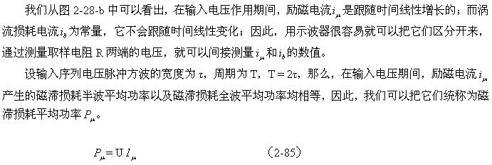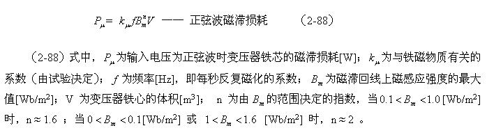 這里順便指出,利用(2-88)和(2-89)式來分別測試變壓器鐵心的磁滯損耗和渦流損耗是非常困難的;一個是它們的系數很難決定,另一個是兩者很難分別進行測量,或從測量結果中進行分離。對比兩式的參數就可以知道,它們之間最大的區別是頻率對損耗的影響程度;一個是與頻率成正比,另一個是與頻率的平方成正比。