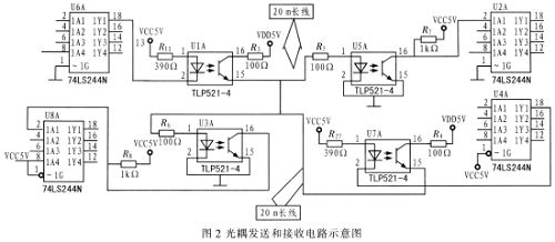 采用光電隔離器TLP521-4對發(fā)送和接收設(shè)備進(jìn)行電氣隔離,對于減小交流阻抗的作用十分明顯,進(jìn)而增大傳輸電流,有效地抑制地線噪聲;同時(shí)由于74LS244N的應(yīng)用。總線驅(qū)動能力得到保障。圖2為光耦發(fā)送和接收電路示意圖。圖2中,上半部兩光耦自左向右傳輸信號,下半部兩光耦自右向左傳輸信號,左端74LS244N通過靜態(tài)存儲器IDT7132與處理器進(jìn)行數(shù)據(jù)交換,右端通過8255與處理器進(jìn)行數(shù)據(jù)交換。
