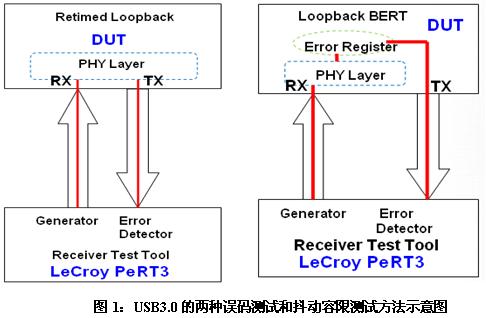 由于USB3.0的速率高達5Gbps,在USB3.0規范中接收機測試成為必測項目。接收機測試包括了誤碼率測試和接收機抖動容限測試兩部分。