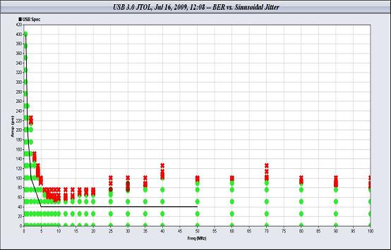 力科PeRT3可以自動測量多個頻點下的抖動容限和誤碼率,如下圖5所示為某USB3.0芯片的抖動容限測試結果,橫軸為頻率,縱軸為該頻點的抖動幅度,黑線為USB3.0規范要求的抖動容限,紅點為出現誤碼的正弦抖動的幅度,由于紅點都在黑線之上,說明該芯片接收端的抖動容限滿足規范要求。