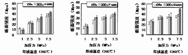 圖9顯示了焊接溫度、焊接時間、加壓等焊接參數(shù)對銀納米粒子銅觸點(diǎn)斷面強(qiáng)度的影響。從圖可得,焊接溫度和加壓是影響斷面強(qiáng)度的關(guān)鍵參數(shù)。在焊接溫度方面,強(qiáng)度隨著加壓增大而上升,但在焊接溫度高的情況下,加壓的影響會變小。另外就焊接溫度而言,加壓低的情況下,焊接溫度對強(qiáng)度影響大,而加壓增高時則焊接溫度的影響變小。所以,在260℃左右的溫度下加大壓力,而盡可能在低加壓場合提高連接溫度,這樣做才最有效。
