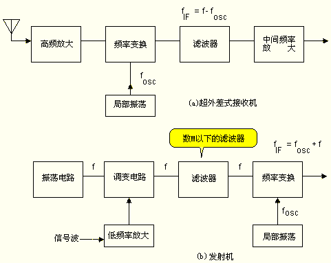 在圖(b)的傳送機中,在做調變工作原理時,所使用的載波頻率不要太高,便可以維持電路的穩定。另外,從濾波器的選擇度觀點來說,也希望所使用的調變為數MHz,也即是,載波頻率較低些,然后經過率變換電路后,便可以達到所需要的頻率。