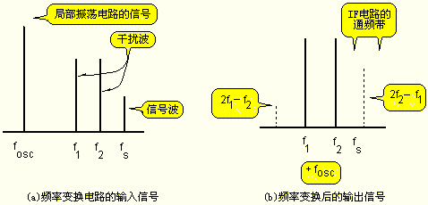 (干擾波也會經過頻率變換,成為(2f1-f2或(2f2-f1)。此一信號在接收頻帶內便會構成問題)。
