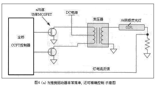 之所以考慮推挽驅動器,因它有很多好處。這種架構只用到n溝道MOSFET(見圖6(a)所示),這有利于降低成本和增加逆變器效率。它很容易適應較高的逆變器直流電源電壓。采用更高的逆變器直流電源電壓時,只需選擇具有合適的漏-源擊穿電壓的MOSFET即可。不管逆變器的直流電源電壓如何,都可采用同樣的CCFL控制器。但采用n溝道MOSFET的全橋和半橋架構就無法做到這一點。對于LCD電視非常理想,因為電視中的逆變器直流電源電壓通常會被穩定在±20%。
