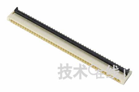 此制品以間距0.3mm、高1.1mm、進深4.3mm(滑片鎖上時)尺寸,制成了90引腳的多極連接器。合適的FPC厚度為0.2mm。因采用上下配備接點的構造,設計時可無需考慮插入的FPC接點方向。