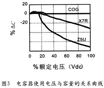 ①電容器的使用電壓對電容器的電容量有影響,穩定性低的介質,在施加額定工作電壓后容量會大幅度下降(見圖3),以至達不到使用效果,這一點在選擇電容器時必須給以充分注意(不能一味追求大容量和小體積,必須在容量和使用電壓上留有充分余地)。