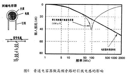 我們平常使用的陶瓷圓片電容器作為旁路電容,可以將高頻干擾短路到地,達到抗干擾的目的。但是電容器的引線電感及電容內部的剩余電感卻限制了它的高頻特性發揮。圖6是普通電容器做高頻旁路時的引線電感影響例。