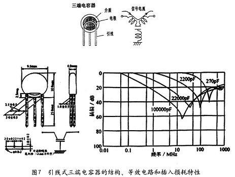 由于普通的兩端電容有引線電感,所以總的剩余電感較大,自諧振點也比較低。為了改進普通引線式電容器的自諧振、且自諧振頻率偏低的問題,村田制作所曾發展了一種引線式三端電容器,見圖7。與兩端電容相比,這個電容的上引線化成了兩根(所以三端電容有三根引線)。三端電容器的這兩根上引線化成了信號傳輸線的一部分,于是引線電感與電容器變成了一個“LC”濾波器。正是三端電容器巧妙地利用了引線電感,使得三端電容器對干擾的抑制作用更好。三端電容器也有自諧振問題,為了最大限度地限制這個問題,使用時三端電容器接地的這根引腳的長度應該受到限制。