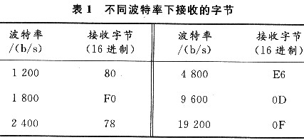 檢測轉換裝置的串口波特率,首先可對主機的接收波特率(以9600b/s為例)進行設定,并在終端發送一個特定的字符(以回車符為例),這樣,主機根據接收到的字符信息就可以確定轉換裝置的通信波特率。回車符的ASCII值是0DH,在不同波特率下接收到的值如表1所列。[page]