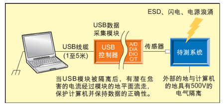 圖2:未隔離的USB數(shù)據(jù)采集模塊在ESD、閃電、電源浪涌的時候可能損害系統(tǒng)并導致數(shù)據(jù)不正確。