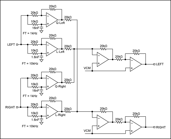 無源方案可以實現該電路,但是更通用的方法是有源電路(圖7)。對于線性信號(相應的輸入通道),電路呈現為一個ft=10kHz的相移濾波器,對于積分信號(另一路輸入),電路呈現為一個ft=1kHz的相移濾波器。目的是使線性輸入信號和積分信號之間在音頻帶寬1kHz至10kHz范圍內呈現90°相移。