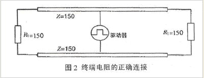 ②阻抗不連續,顧名思義,與光從一種媒質進入另一種媒質時所引起的反射是相似的。信號在傳輸線末端突然遇到電纜阻抗很小甚至沒有,信號在這個地方就會引起反射。消除這種反射最常用的方法,是在電纜的末端跨接一個與電纜的特性阻抗同樣大小的終端電阻,使電纜的阻抗連續。由于信號在電纜上的傳輸是雙向的,因此,在通訊電纜的另一端同樣要跨接一個相同大小的終端電阻,如圖2所示。