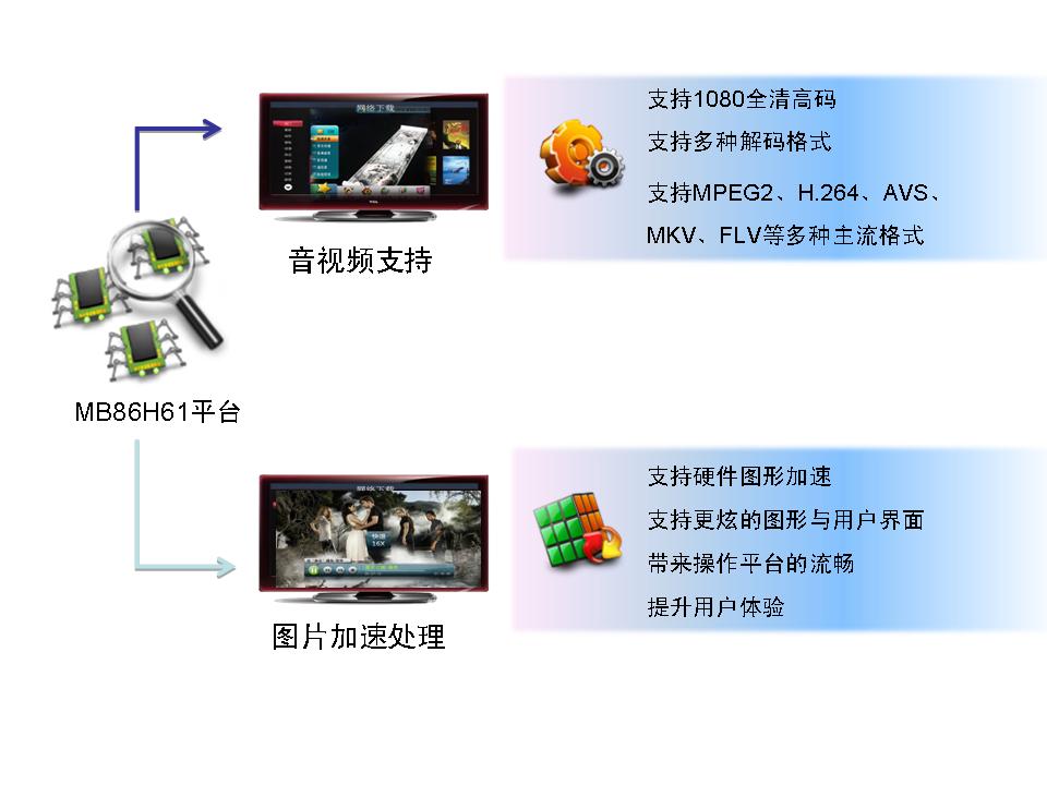MB86H61系列芯片基于多核CPU架構,內部集成了富士通獨有專利技術的硬件視頻處理器視頻解碼單元解碼全高清/標清MPEG-2、H.264、VC-1、AVS、FLV、MKV等多種視頻格式,而音頻解碼單元則采用高性能的ARC725TM(594DMIPS)支持DD、DD+、AAC、DRA等多種先進音頻格式。因此,該芯片的ARM11內核主CPU將全部用于處理應用程序,其性能將有足夠的裕量,能充分保證系統運行的平穩流暢。“獨立的硬件圖形加速功能還使其能更輕松地支持豐富的圖形用戶界面、高清圖片顯示,從而大大提升用戶體驗。”富士通半導體業務發展總監黃自力表示,“該芯片對于全高清AVS視頻解碼的支持尤其值得一提,目前市場上大部分的高清芯片所能支持的AVS解碼還停留在標清階段。”