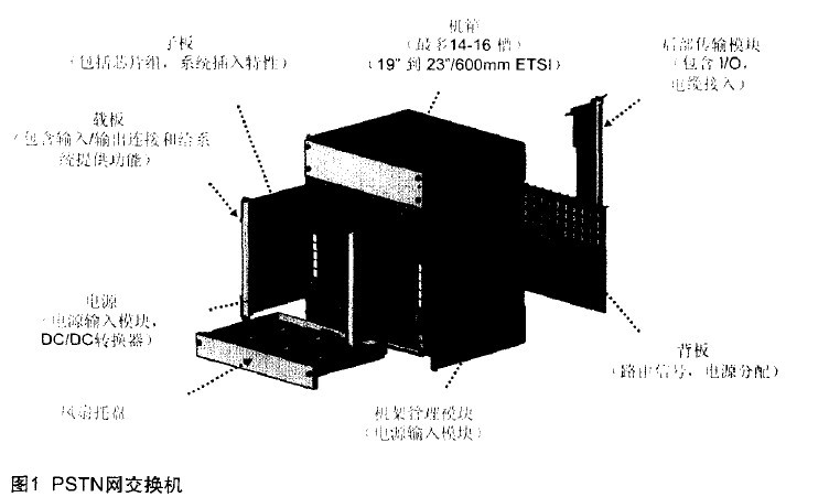 圖1所示為一個PSTN網的交換機,該交換機由7個部分組成。除了機箱尺寸的區別,機箱底部是一個機架的管理模塊,它包括管理模塊、傳輸背板和傳輸模塊。最前面有子板、載板、電源板,以及風冷系統、電扇托板。在交換機中,它的主要載板就是電話信息的傳輸以及輸入/輸出的連接,輸入,輸出系統所組成的只有很少的電腦板以及信令控制板。