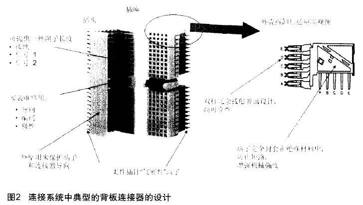 圖2是典型的連接系統中背板連接器的設計。它可以提供三種端子長度,即接地端子、信號1端子、信號2端子三個端子的長度是不同的。這是為了保證插座和插針在互相連接的時候,如果接反了,就無法插入。第二個是中問部分,它是用于安裝維修用的,整個插針板在插入的過程中,可以用來導向,甚至可以保證編碼和極性的正確。外壁用來保護端子和連接器的導向,這個端子就是插針部分,采用柔性插針。從右半部分圖中可以看到,外殼被拆除后,更清楚地顯示出了接觸面。它采用了雙柱冗余的接觸面設計,這樣可以大大提高接觸的可靠性。