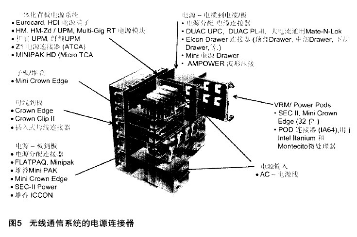 無線通信系統中所采用的電源連接器(圖5)的種類包括一體化背板電源系統、子板/堆疊用連接器、信號母線到板之間的連接器、板到板的電源連接器、電源到電纜/電纜Nrn; 刷板連接器、微處理器所用電源連接器以及電源輸入所用連接器。