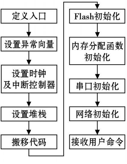 本設(shè)計中采用了帶有SNMP協(xié)議的μClinux操作系統(tǒng),實(shí)現(xiàn)方式簡單。不僅完成了串行接口到網(wǎng)絡(luò)接口的轉(zhuǎn)換,還使用戶可以通過監(jiān)控界面按照SNMP協(xié)議標(biāo)準(zhǔn)進(jìn)行統(tǒng)一管理。對于μClinux系統(tǒng)U-boot是最合適的Bootloader,其設(shè)計過程如圖5所示。