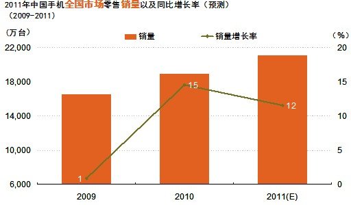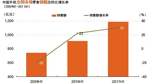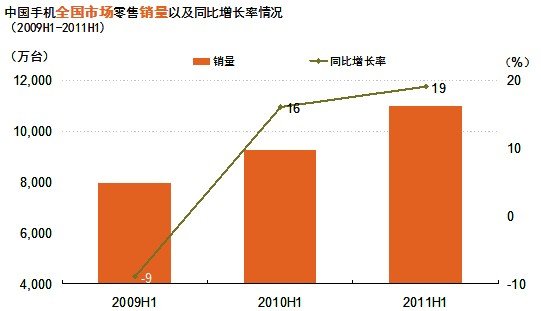 2011年上半年手機市場繼續保持較快增長。據GfK(捷孚凱中國)全國零售監測數據顯示,2011年上半年銷售量已達到1.1億臺,同比增長19%,銷售額達到1186億元,銷售額同比增長30%。
