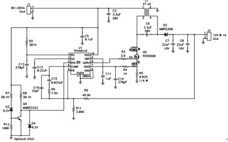 構(gòu)建起如圖3 所示電路,并對其進(jìn)行描述。該電路可在汽車市場獲得應(yīng)用。這里,其擁有一個(gè)8V 到36V 的寬范圍輸入,可以為穩(wěn)定12-V 輸出以上或者以下。汽車市場更喜歡使用陶瓷電容器,原因是其寬溫度范圍、長壽命、高紋波電流額定值和高可靠性。結(jié)果,耦合電容器(C6) 便為陶瓷的。這就意味著,相比電解電容器,它擁有較高的AC 電壓,同時(shí)這種電路會對低漏電感值更加敏感。