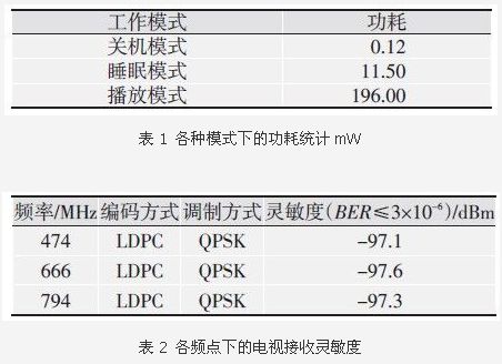 智能手機平臺系統(tǒng)測試,除了通信部分的基本指標外,對于手機電視而言,最關(guān)鍵的指標是各種模式下的功耗和接收靈敏度。測試平臺采用CMMB信號發(fā)生器、誤碼測試儀、萬用表和待測智能手機等組成,測試結(jié)果如表1、表2所示。