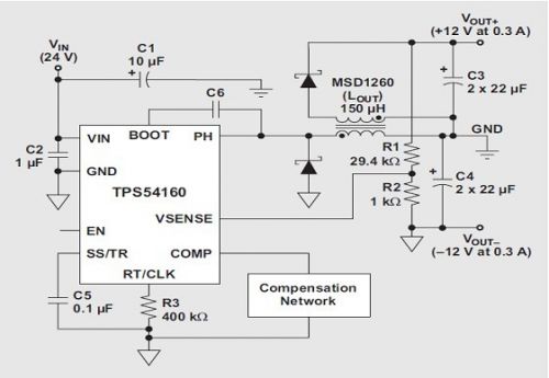 匹配正負電源軌是許多工業應用的常見要求,對放大器而言更是如此。我們可以對寬輸入范圍降壓轉換器進行配置,以提供負輸出電壓。使用一個耦合電感代替這種反相降壓轉換器的電感,并增加一個二極管和電容器,便可將這種反相降壓轉換器變為一個雙輸出的轉換器。圖 3 顯示了以這種方法使用的 TI TPS54160 和 Coilcraft 150-μH MSD1260。只要每個軌的負載稍有接近,我們就對每個軌之間的差異進行調節而非單獨調節每個軌,但耦合電感卻可以幫助提供對每個軌進行調節。