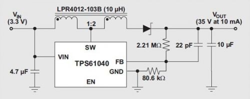 集成 FET 的 DC/DC 轉換器的輸出電壓受限于轉換器的開關電流額定值。將一個 1:1 以上匝比的耦合電感連接至轉換器的開關 (SW) 引腳,可以擴展所有升壓轉換器的有效輸出電壓范圍。例如,圖 4 顯示了 30-V 絕對最大電流額定值的 TI TPS61040 升壓轉換器,其作用是提供 35V 或更高的電壓,同時還顯示了一個 1:2 耦合電感 Coilcraft LPR4012-103B。耦合電感結構多繞組端與二極管串聯時,單繞線電感——以及由此產生的轉換器開關 FET—電壓只有輸出電壓的三分之一,即負輸入電壓。