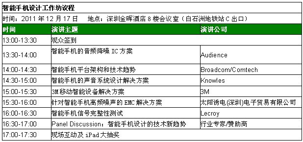HTC、SAMSUNG、LG、SHARP、AT&T、SK Telecom、PANTECH、DoCoMo 等手機設計領軍廠商在智能市場領域的競爭非常激烈,他們都用到哪些技術?由我愛方案網(www.52solution.com)、電子元件技術網(www.mengyueyun.cn)和China Outlook Consulting主辦的首屆智能手機設計工作坊(Smart Phone Design Workshop)將于2011年12月17日下午在深圳金暉酒店8樓會議室隆重召開!為您Hold 住 2012 智能趨勢,給力手機開發設計!