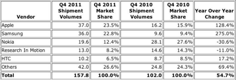 - 2011年第4季度全球智能手機(jī)銷量同比增長(zhǎng)了54.7%