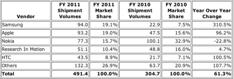 三星在第4季度完成了一系列重大的成就:首次突破了3000萬臺(tái)的銷量大關(guān),成為了各大智能手機(jī)企業(yè)同比增長(zhǎng)最快的企業(yè),同時(shí)在2011年成為了智能手機(jī)整體市場(chǎng)的領(lǐng)頭羊。其Galaxy系列智能手機(jī)的市場(chǎng)份額進(jìn)一步擴(kuò)展,先后推出了針對(duì)高端市場(chǎng)的Galaxy S II和Galaxy Nexus,以及針對(duì)大眾市場(chǎng)的Galaxy Ace以及Galaxy Y等。同時(shí)該公司還在Windows Phone Mango的基礎(chǔ)上更新了其Omnia和Focus等產(chǎn)品。