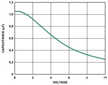 本例中,X5R電介質在–40°C至+85°C范圍內的TVAR為15%;TOL為10%;CBIAS在1.8 V時為0.94 μF,如圖4所示。將這些值代入公式1,即可得出: