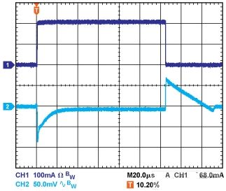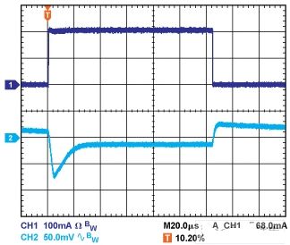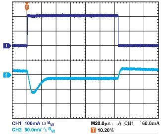 輸出電容還會影響調節器對負載電流變化的響應。控制環路的大信號帶寬有限,因此輸出電容必須提供快速瞬變所需的大多數負載電流。當負載電流以500 mA/ μs的速率從1 mA變為200 mA時,1 μF電容無法提供足夠的電流,因而產生大約80 mV的負載瞬態,如圖1所示。當電容增加到10 μF時,負載瞬態會降至約70 mV,如圖2所示。當輸出電容再次增加并達到20 μF時,調節器控制環路可進行跟蹤,主動降低負載瞬態,如圖3所示。這些示例都采用線性調節器ADP151,其輸入和輸出電壓分別為5 V和3.3 V。