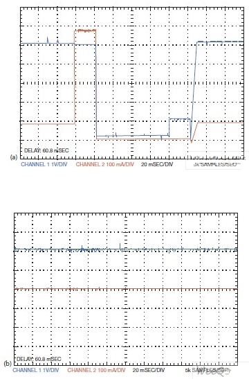 圖2,圖1中的這些電流/電壓波形表示輸出端A的一個過載 (a) 并不影響輸出端B (b)。