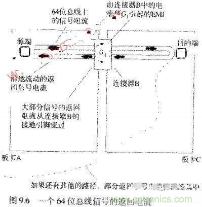 圖9.6舉例說明了一個普通的電磁干擾問題。一個64位總線從板卡A經過連接器B連到母板卡上,母板卡可能是一個主CPU卡或是一個通往其他子卡的無源通道。64條信號線的返回電流從母板卡C流回板卡A,其中的絕大部分通過了連接器B的接地腳。
