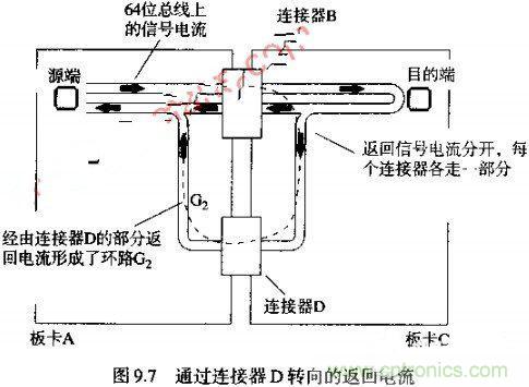 例如,在圖9.7中,假設板卡A和C共用兩個連接器,另外增加的連接器記為D,將其安排在與連接器B相隔一段距離的地方。現在有一部分信號的返回電流可以由連接器D上的地線流加A,如圖9.7中的環路G2所示。
