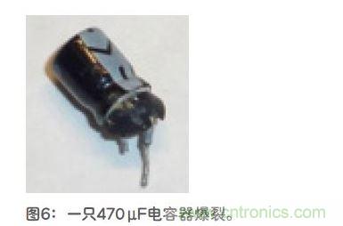 接著我用儀表檢測(cè)輸出電壓。在繼續(xù)閱讀下文之前,請(qǐng)回頭看一下圖2。你是否注意到最左邊那個(gè)緊鄰USB連接器的470μF電容器?我的手指擦過(guò)這個(gè)電容器,覺(jué)得很燙。然后我聽(tīng)到呼的一聲,發(fā)現(xiàn)電容器爆裂開(kāi)來(lái),封裝的底端飛彈出去,見(jiàn)圖6。