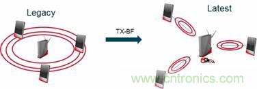 圖1. 借助 802.11ac(和802.11n)波束成形技術,無論周邊有多少設備,集線器或AP都能讓無線信號直接傳向需要信號的設備。與此形成對比的是,傳統Wi-Fi技術只能在設定區域輻射無線信號,而該區域內的任何設備都能接收該信號。