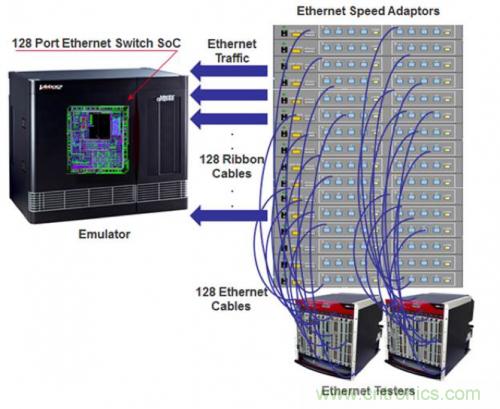交換機(jī)和路由器已達(dá)到 256 個(gè)端口(到年底將會(huì)增加到 1024 個(gè)端口),而且它們可處理高達(dá) 120 Gb/s 的流量。同時(shí),網(wǎng)絡(luò)交換的延遲也在持續(xù)下降中,最低延遲已降至 1 µs。所有這些因素促使如今的網(wǎng)絡(luò)交換機(jī)和路由器芯片成為有史以來最大規(guī)模的芯片,達(dá)到了五億門級(jí)。在流片完成之前驗(yàn)證此類復(fù)雜 IC 設(shè)計(jì)是一項(xiàng)難以完成的任務(wù)。我們來考慮下具有 128 端口以太網(wǎng)接口的 SoC 設(shè)計(jì)。