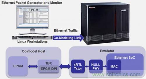 在此場(chǎng)景中,以太網(wǎng)測(cè)試儀模型運(yùn)行于連接到硬件仿真器的Linux工作站上。基于成熟的實(shí)現(xiàn) IP,模型準(zhǔn)確再現(xiàn)了實(shí)際的物理測(cè)試儀。這種虛擬測(cè)試儀包括以太網(wǎng)數(shù)據(jù)包生成器和監(jiān)視器 (EPGM),可以為 1G、10G、40G/100G 和 120G 網(wǎng)絡(luò)分別配置 GMII、XGMII、XLGMII/CGMII 和 CXGMII 接口。每個(gè)支持的MII端口都需要一個(gè) xRTL 事務(wù)處理器(圖 2)。