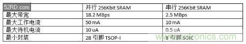 所有這些發展趨勢都指向一個要求:一個小巧、能夠只扮演緩存的角色、并能使用最小數量的引腳相連的外置SRAM。串行SRAM就是專為滿足這個要求而量身定做的。存儲器在高速性能并非最重要因素的其它存儲器(DRAM、閃存等)中,串行接口已經取代了并行接口。由于存在需要SRAM的應用,串行SRAM在SRAM市場中一直處于小眾地位。在空間非常有限的特定應用中,它們一直是低功耗、小尺寸替代方案。目前,在峰值時鐘速率為20MHz(10MB/s帶寬)條件下,串行SRAM最大容量為1Mbit。相比之下,并行SRAM的帶寬高達250MB/s,并支持最大64Mbit的容量。下表對比了一個通用型256Kbit并行SRAM和一個256Kbit串行SRAM。